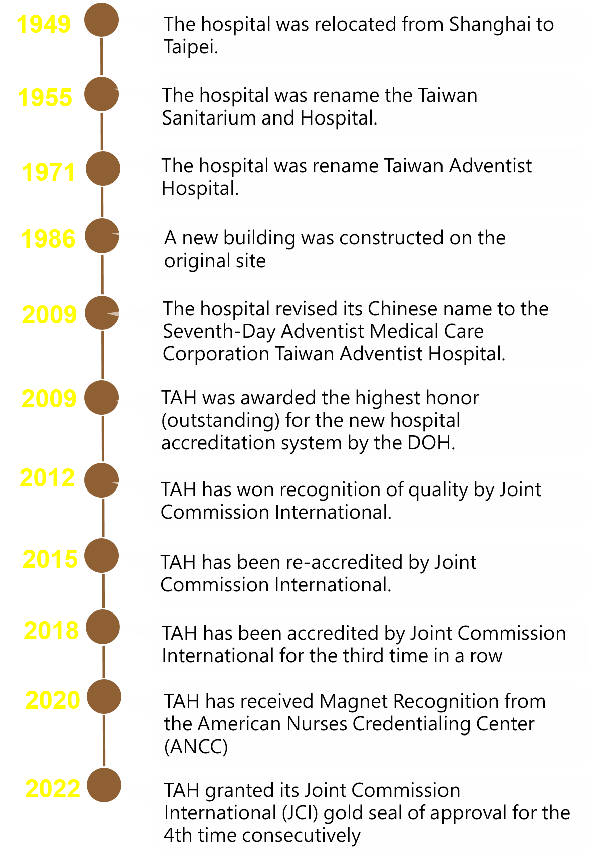 Taiwan Adventist Hospital (TAH), established in 1955, is one of over 170 healthcare institutions operated by the Seventh-Day Adventist Church in a worldwide missionary system. TAH invested a large amount of resources and constantly to enhance medical quality for ensuring that patients are getting the best and safe care with ultimate safety.